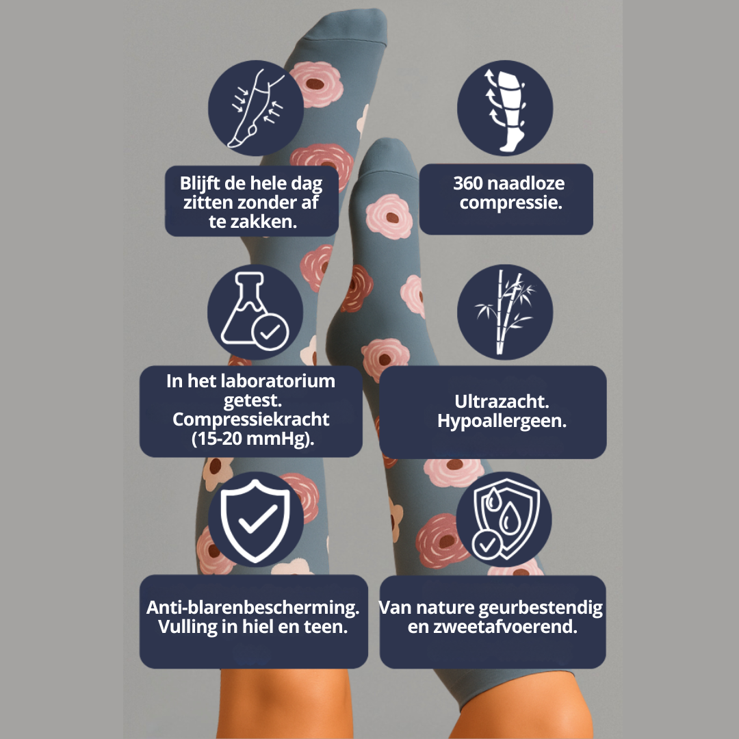 Ervaar het verschil. Onze compressiekousen bevorderen de bloedsomloop, waardoor uw benen de hele dag door lichter, energieker en minder vermoeid aanvoelen.